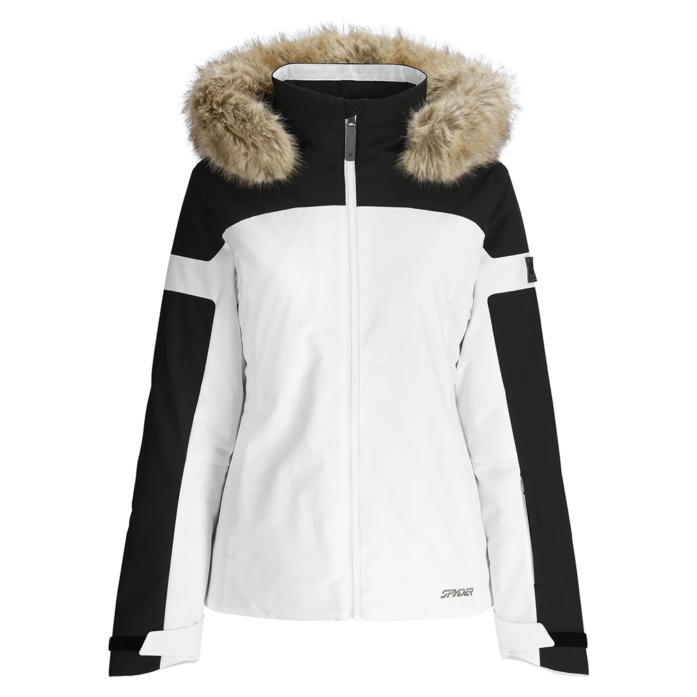 This jacket includes a fixed hood with snap‑off faux fur trim, under‑arm ventilation, a fixed powder skirt with snap‑back design, adjustable cuff tabs with integrated thumbholes, and a mesh goggle pocket with chamois wipe. The white colorway adds a refined alpine look for resort style as well as performance.